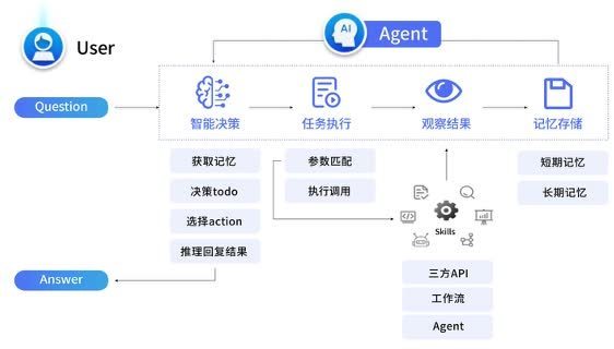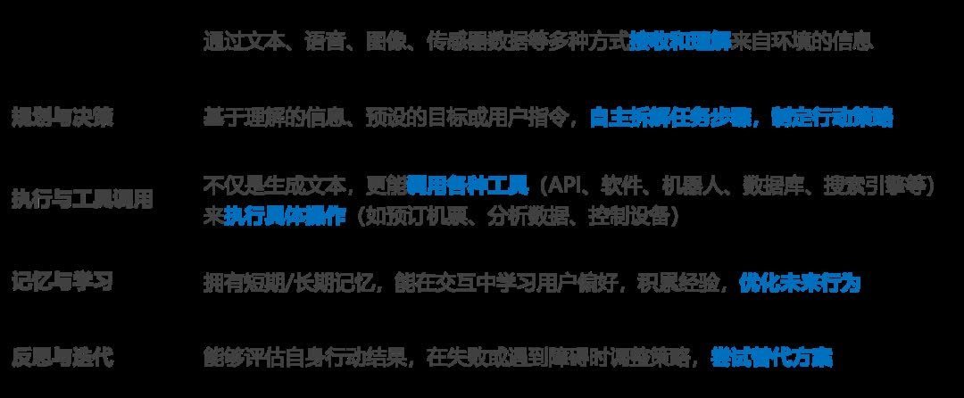 简言之,AIAgent=大型语言模型+规划决策能力+工具调用能力+记忆/学习能力。它是能独立完成复杂任务闭环的“智能执行者”。